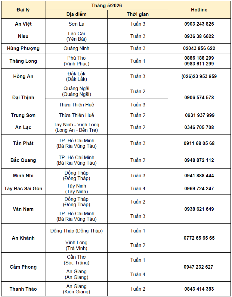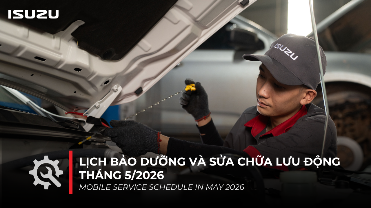 Trong khuôn khổ các hoạt động nâng cao trải nghiệm khách hàng, ISUZU Việt Nam trân trọng thông báo lịch trình triển khai chương trình “Bảo dưỡng & Sửa chữa lưu động” trong tháng 5 năm 2026, nhằm tiếp tục mang dịch vụ chính hãng đến gần hơn với Quý Khách ở xa. Tại chương trình, Quý khách hàng sẽ được: