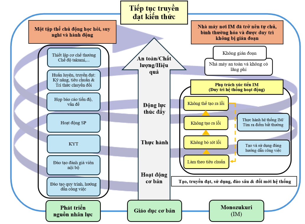 Bên cạnh đó, dựa trên suy nghĩ “con người dù cố gắng vẫn có thể mắc lỗi”, IM xây dựng cơ chế quản lý chất lượng theo mô hình xoắn ốc (spiral up) với 3 bước: “không bỏ sót lỗi”, “không tạo ra lỗi” và “không thể tạo ra lỗi”, dựa trên bước nền tảng “sản xuất theo tiêu chuẩn”, nhằm ngăn chặn sản phẩm lỗi đưa ra thị trường và đến tay khách hàng, hướng đến mục tiêu đảm bảo chất lượng 100%.