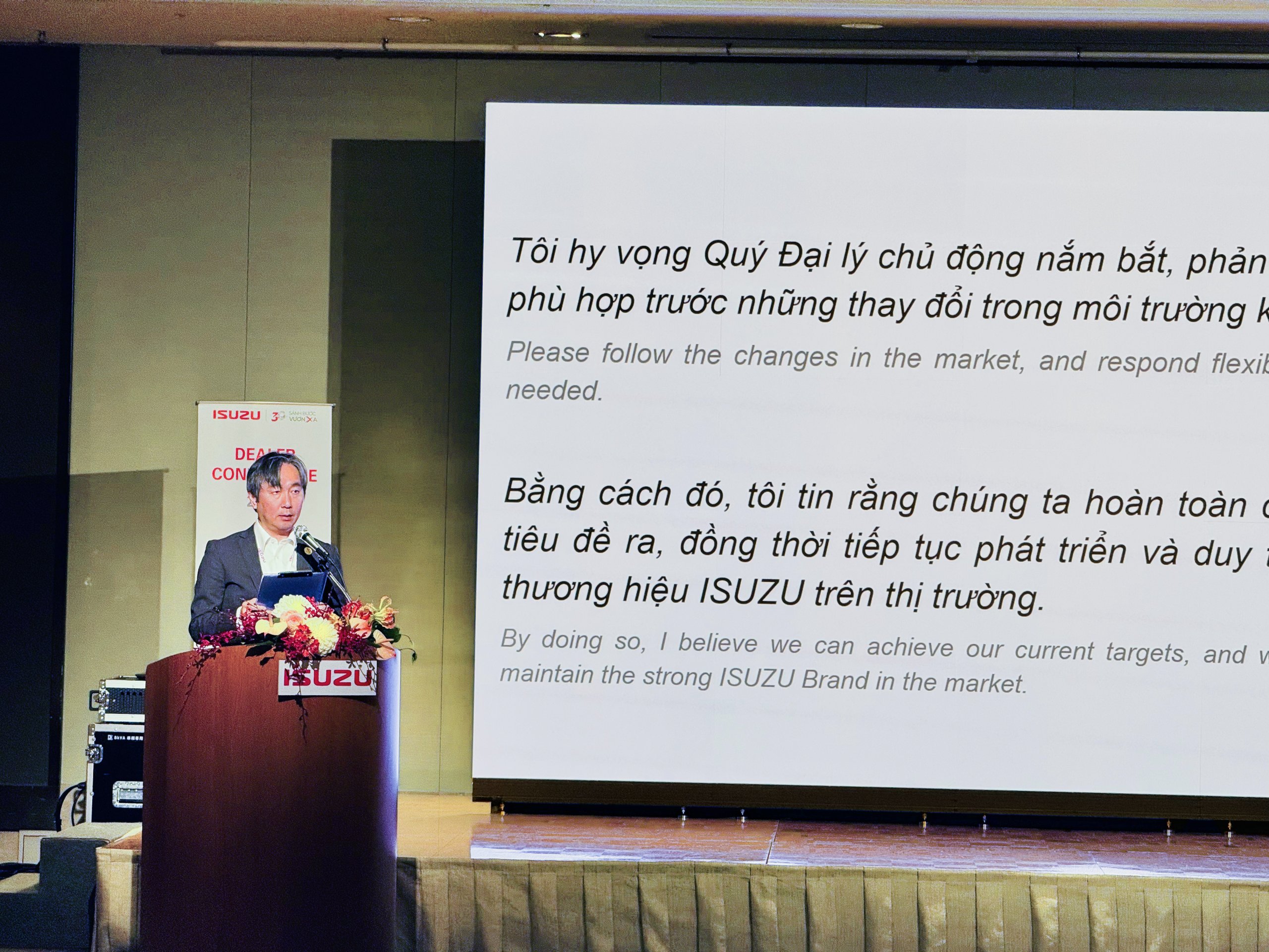 Phát biểu định hướng, ông Wataru Nakano – Tổng Giám đốc ISUZU Việt Nam – chia sẻ: “Tôi hy vọng Quý Đại lý chủ động nắm bắt, phản ứng linh hoạt, kịp thời và phù hợp trước những thay đổi trong môi trường kinh doanh. Bằng cách đó, tôi tin rằng chúng ta hoàn toàn có thể đạt được các mục tiêu đề ra, đồng thời tiếp tục phát triển và duy trì vị thế vững mạnh của thương hiệu ISUZU trên thị trường.”