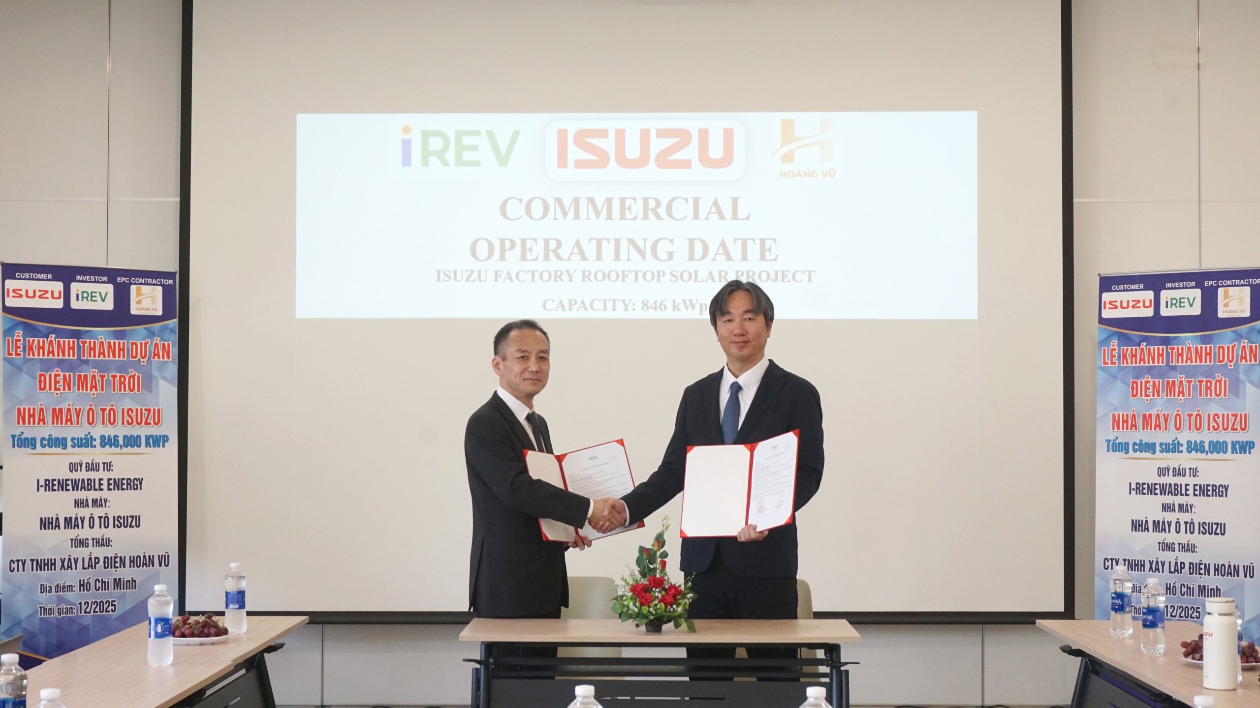 Mr. Wataru Nakano – General Director of ISUZU Vietnam (right) and Mr. Tomoyuki Itabashi – General Director of iREV (left) signing the Commercial Operation Date announcement.