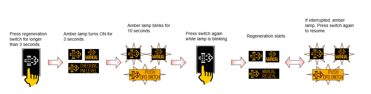 - Press the DPD switch until the DPD manual regeneration indicator lamp (amber) turns on. The DPD manual regeneration indicator lamp (amber) will change from stay on to blinking.